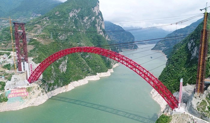 秭歸長江大橋?yàn)橹谐惺戒撓滂旒芄皹颍骺?31.2米,全長883.2米,采用2×200噸纜索起重機(jī)安裝,2018年5月22日主拱合龍。