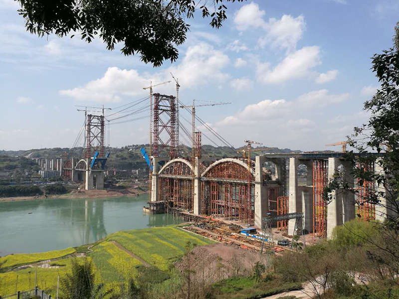 該橋?yàn)閲鴥?nèi)跨徑大的中承式公鐵兩用鋼箱拱橋,主跨336米,采用400噸纜索起重機(jī)吊裝施工,主拱于2017年6月合龍,合龍精度4毫米。