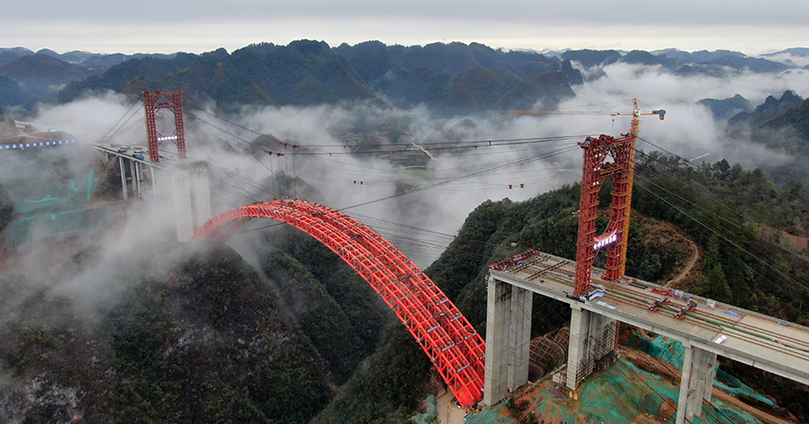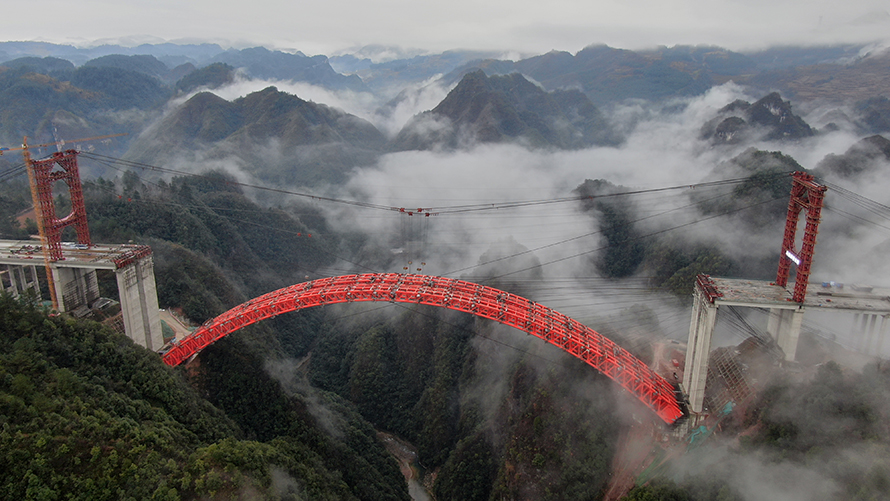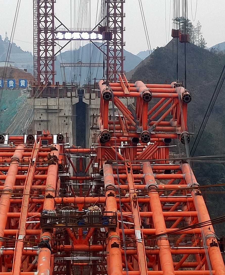 烏梅河特大橋?yàn)樯铣惺戒摴芑炷凌旒芄皹颍L928m,主跨300米,采用160噸纜索起重機(jī)安裝。主拱于2021年2月4日合龍。