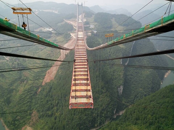 貴州貴甕高速清水河特大橋,主橋2178米,主跨為1130米雙塔單跨鋼桁架加勁梁懸索橋,橋高520米,采用2×100噸纜索起重機安裝加勁梁,建成后成為亞洲山區(qū)懸索橋和世界第二高橋之稱號。