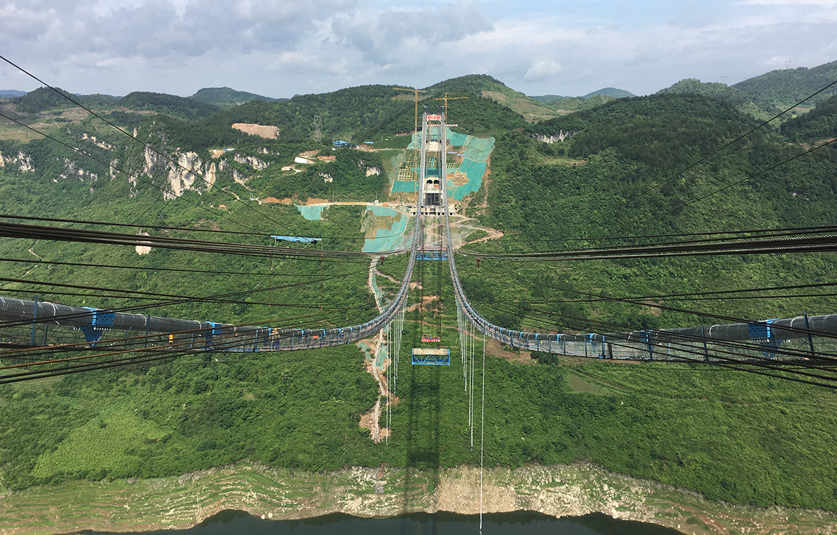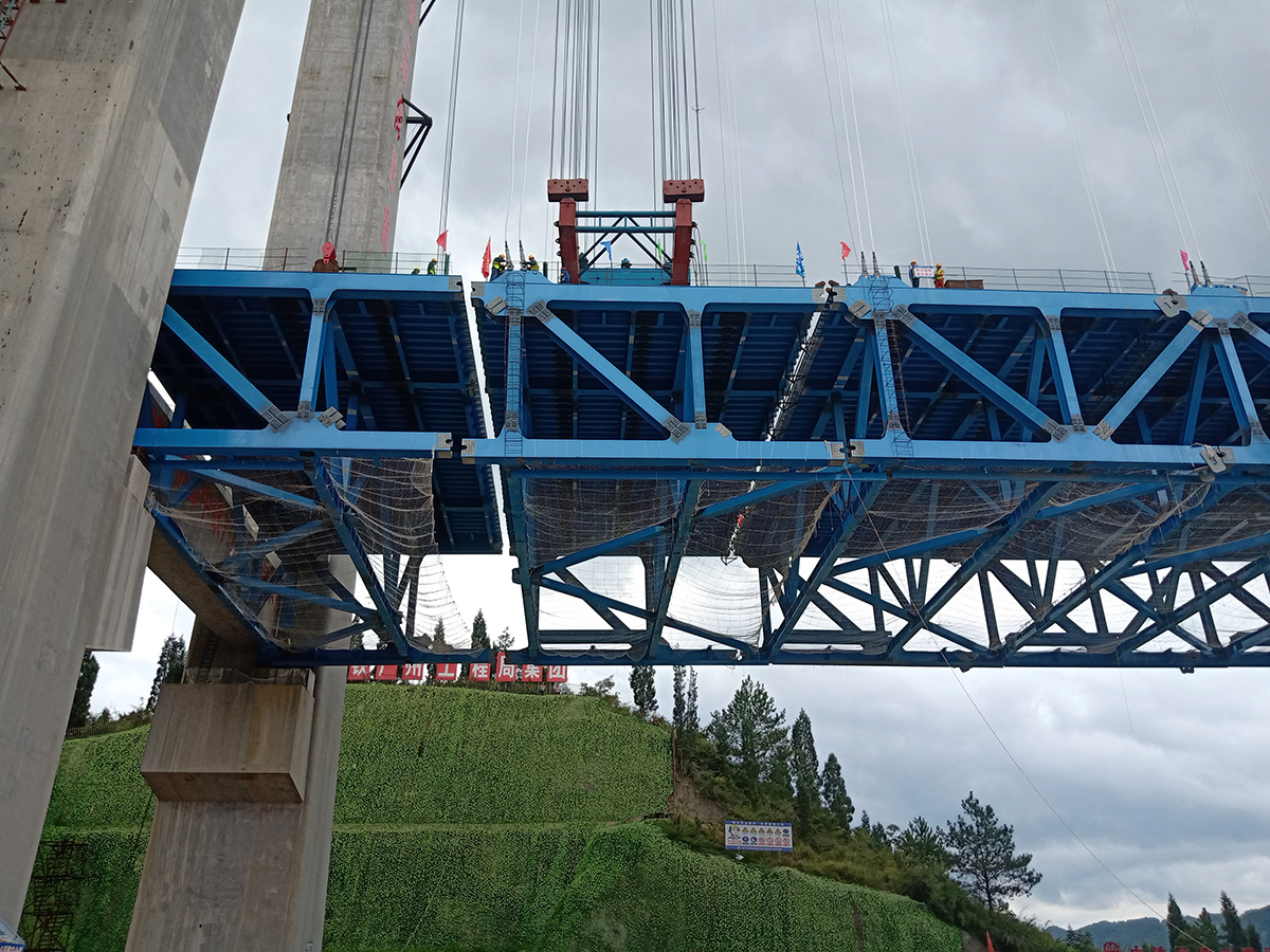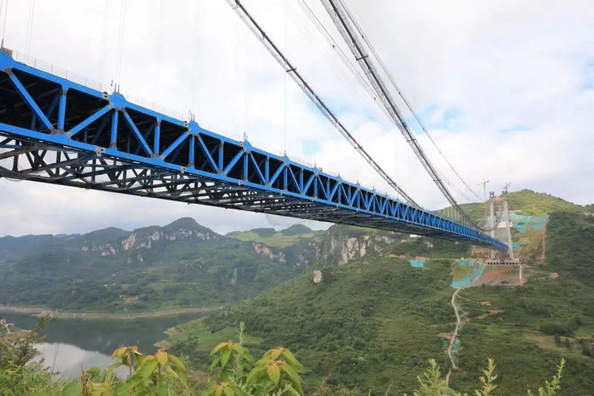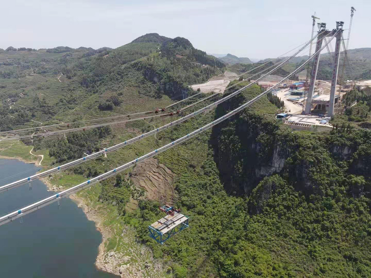 甕開高速開州湖特大橋,為主跨1100米的雙塔單跨鋼桁梁懸索橋,全長1257米,主塔高139米。采用2×125噸纜索吊進(jìn)行安裝,于2021年8月17日合龍。