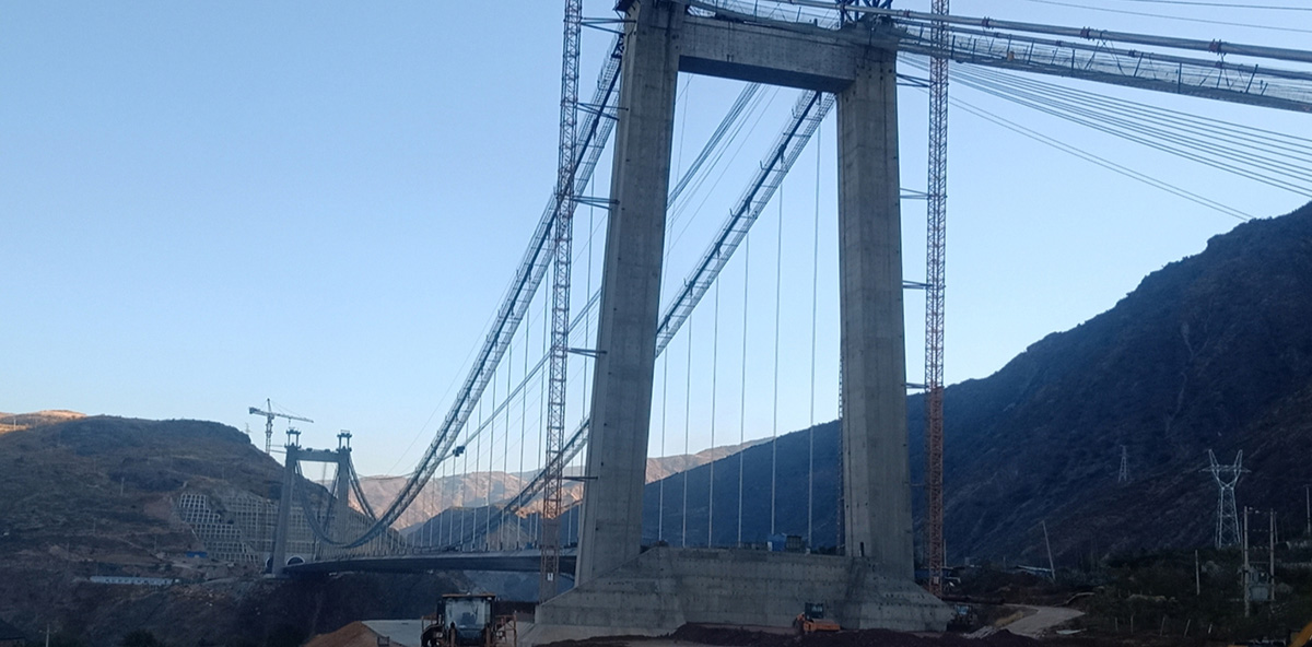 該橋為單跨鋼箱梁懸索橋,主跨636米,采用2×85t纜索起重機安裝,2019年12月31日合龍。